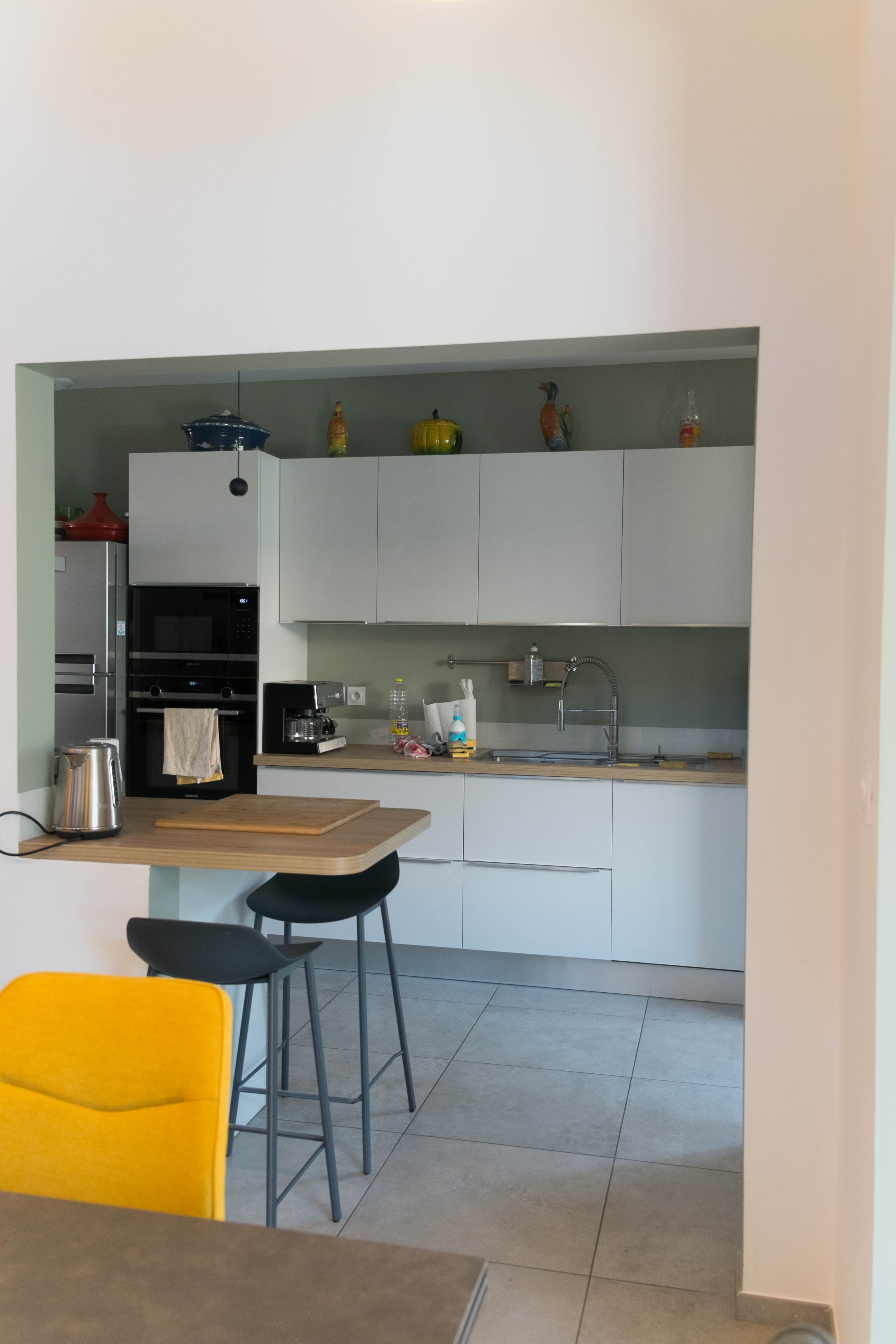 Le séjour, côté rue, orienté est-sud-ouest, s’articule autour d’une cuisine ouverte. Vous attendent dans cette zone de vie,